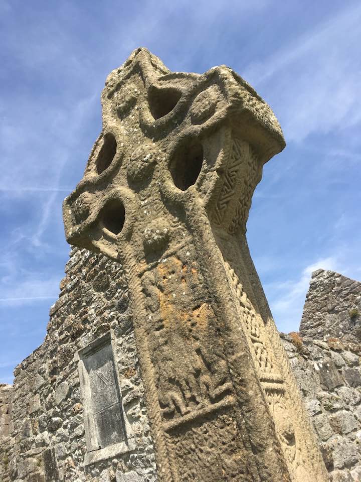 An Irish Cross is a Celtic cross. It is also known as the Cross of Iona or the High Cross. They are all Celtic crosses often decorated with traditional Gaelic symbols or Celtic knots. These magnificent large stone crosses were typically erected to memorialize prominent people or places like churches or monasteries. One of the most famous crosses is at Clonmacnoise, Ireland. The Clonmacnoise cross is known as the Cross of the Scriptures. Large beautiful medieval stone Celtic crosses adorn the country landscape in Ireland ranging in sizes with the largest standing at 23 feet tall.